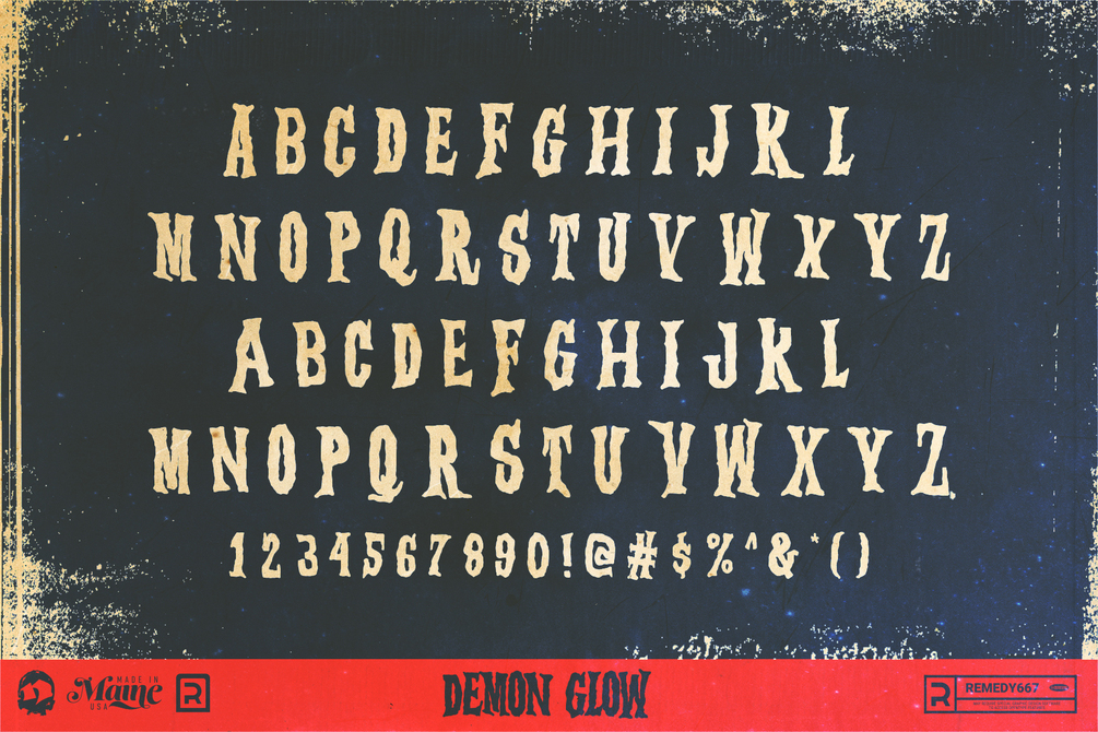 Demon Glow is familiar like the cover of an old book… a distant memory. Inspired by 1980’s horror novels, Demon Glow is ready for titles, posters, logos, shirts, bags, records and other merchandise… not to mention books and movies. It’s gritty, handmade look gives it a classic feel, and evokes a haunting curiosity that helped sell the books that inspired it. Demon Glow. Just keep repeating, ‘it’s on a font… it’s only a font…’