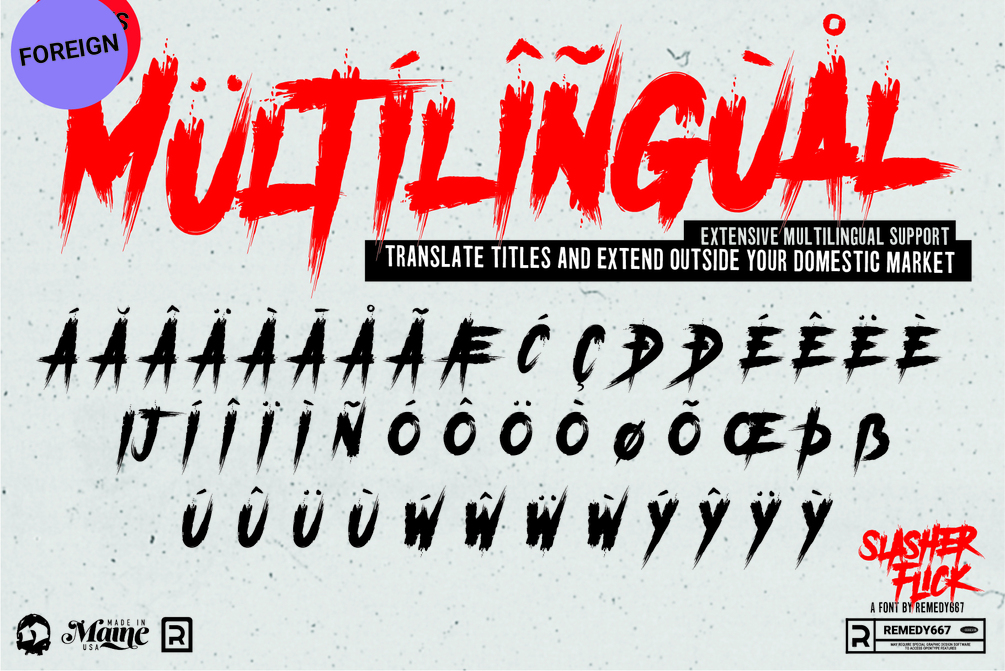 Influenced by 80’s massacre movies, Slasher Flick brings the bloodshed. Up your body count in any film titles, book covers, gigposters, skateboards, packaging… virtually anything. Slasher Flick kills it.