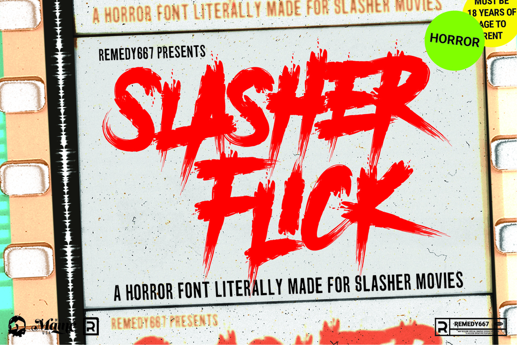 Influenced by 80’s massacre movies, Slasher Flick brings the bloodshed. Up your body count in any film titles, book covers, gigposters, skateboards, packaging… virtually anything. Slasher Flick kills it.