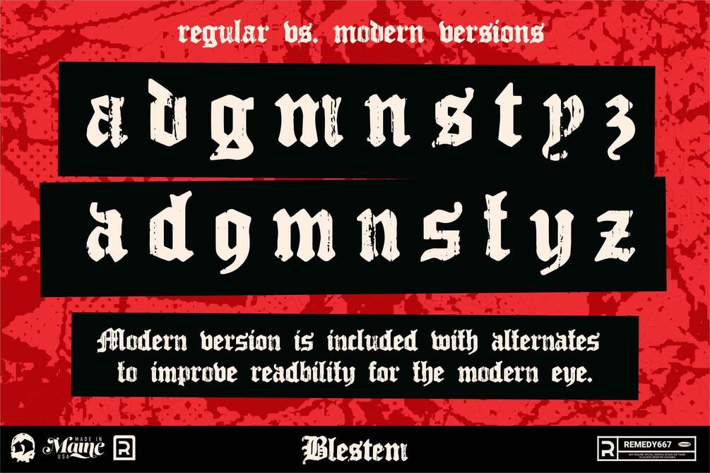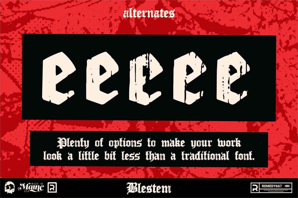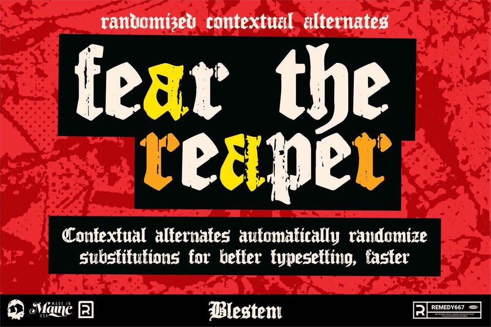Blestem is inspired by woodblock printing, along with the idea of how wood deteriorates as it is weathered by time. It is presented in a Blackletter style typeface. The textures presented in Blestem are taken from real pieces of wood that have been weathered and abused over time, and converted into a vector format for font digital creation. There are many variations of each letter so the font can appear more natural, and have a wider variety of uses.